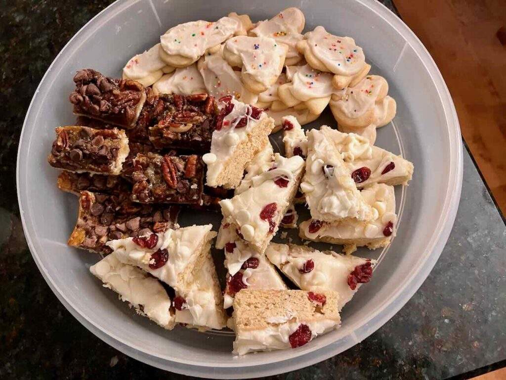 My holiday baking got done yesterday. I made my yearly batch of sugar cookie cutouts, plus chocolate pecan pie bars. I doubled my small batch recipe and baked it in an 8×8 square pan. It worked perfectly! The cranberry bars are a copycat recipe of the cranberry bliss bars from Starbucks.