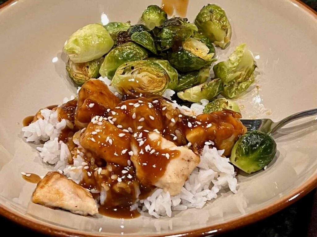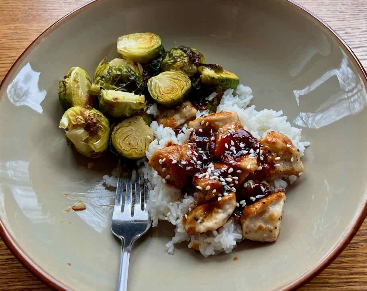- Serve the chicken and sauce over rice topped with sesame seeds and the Brussels sprouts on the side.