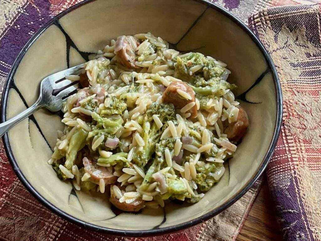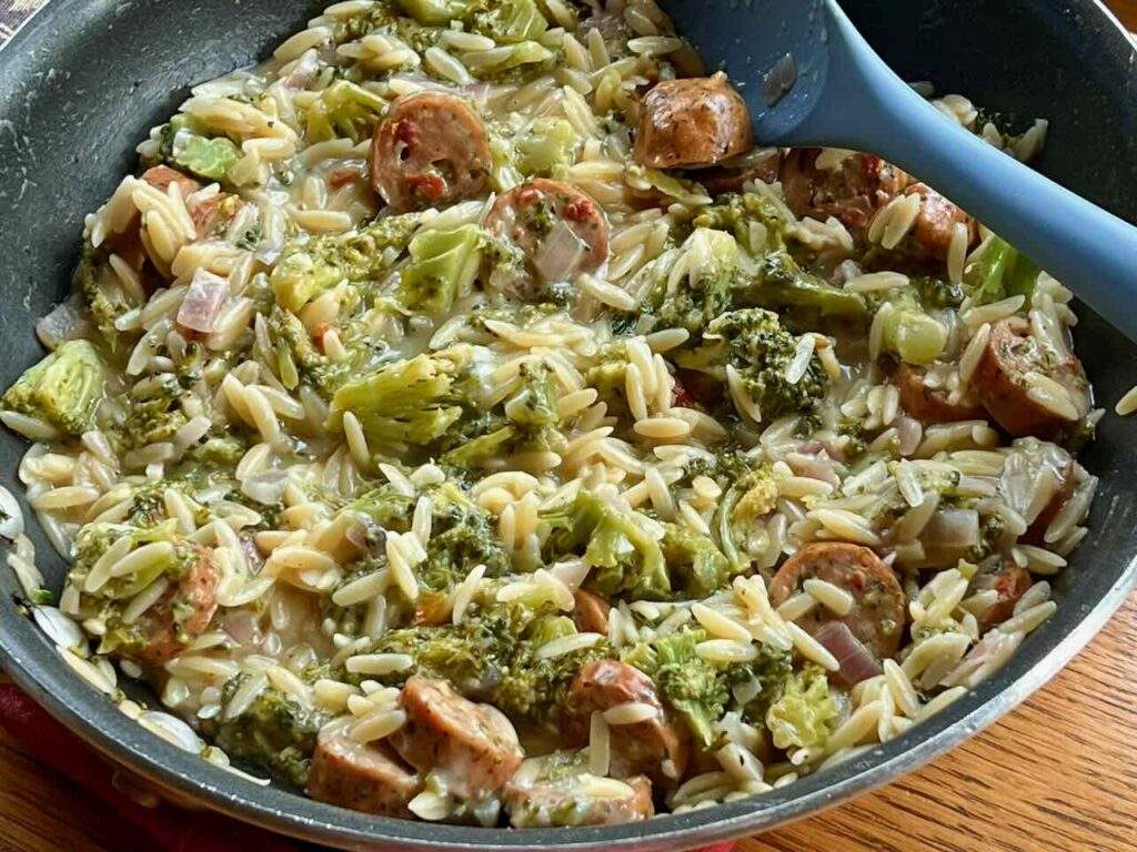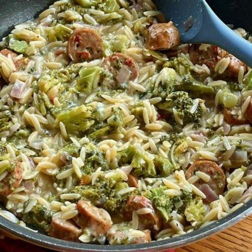 Lemon orzo with broccoli & chicken sausage is an easy, complete meal made in one skillet. The dish is healthy and colorful thanks to broccoli, one of our favorite veggies. Lemon adds brightness to the dish. Finally, two kinds of cheese are used to make sure the final results are delicious.